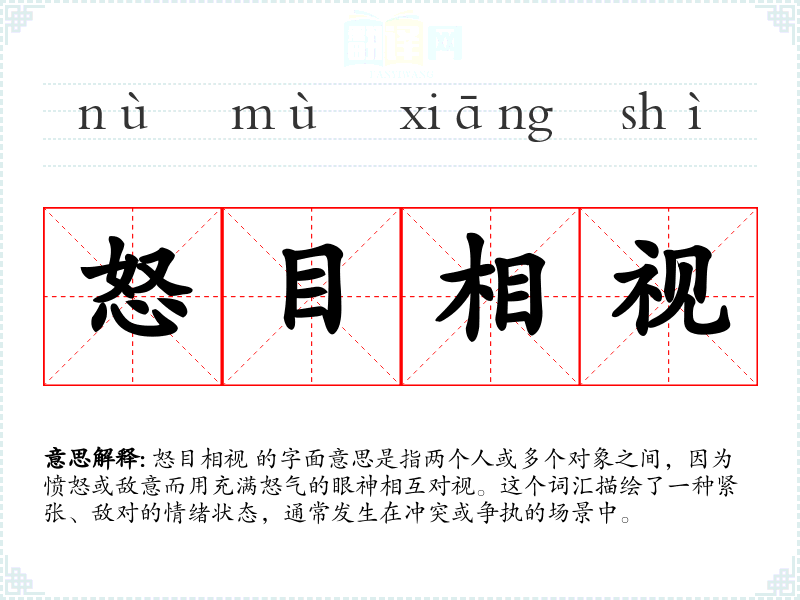 - 同义词:瞪眼、怒视、对峙