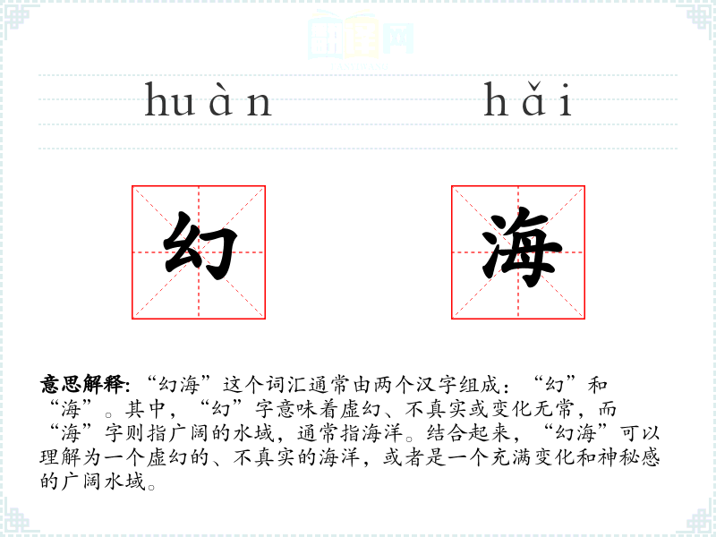 “幻海”这个词汇通常由两个汉字组成:“幻”和“海”。其中,“幻”字意味着虚幻、不真实或变化无常,而“海”字则指广阔的水域,通常指海洋。结合起来,“幻海”可以理解为一个虚幻的、不真实的海洋,或者是一个充满变化和神秘感的广阔水域。