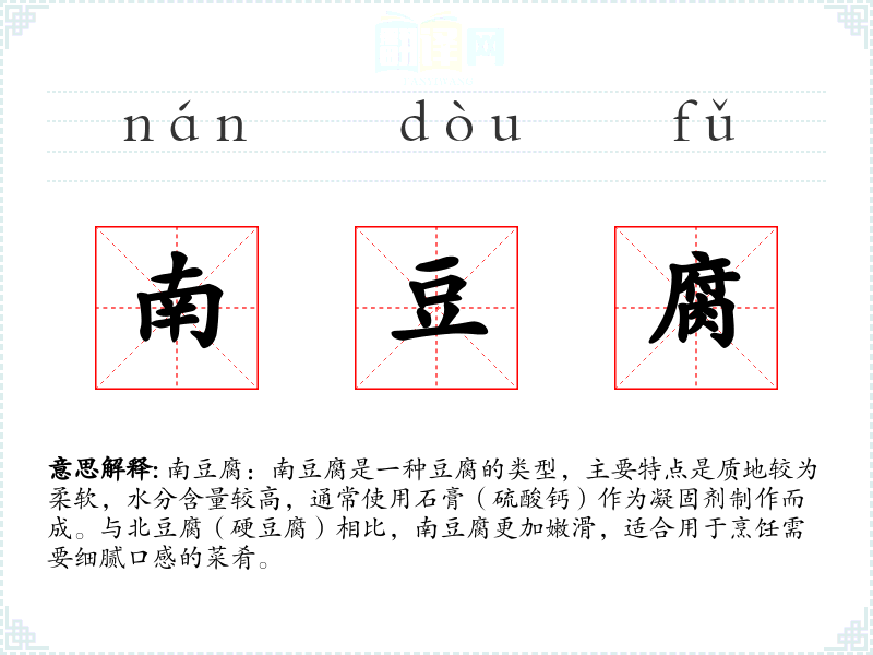 同义词:嫩豆腐、软豆腐 反义词:北豆腐、硬豆腐