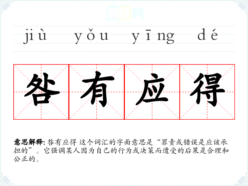 咎有应得 这个词汇的字面意思是“罪责或错误是应该承担的”。它强调某人因为自己的行为或决策而遭受的后果是合理和公正的。