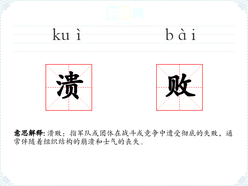 溃败:指军队或团体在战斗或竞争中遭受彻底的失败,通常伴随着组织结构的崩溃和士气的丧失。