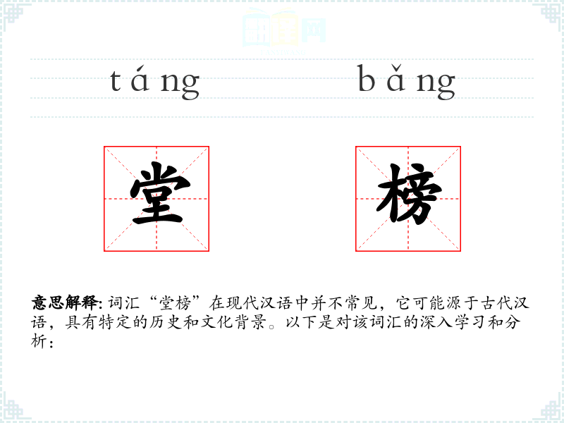 词汇“堂榜”在现代汉语中并不常见,它可能源于古代汉语,具有特定的历史和文化背景。以下是对该词汇的深入学*和分析: