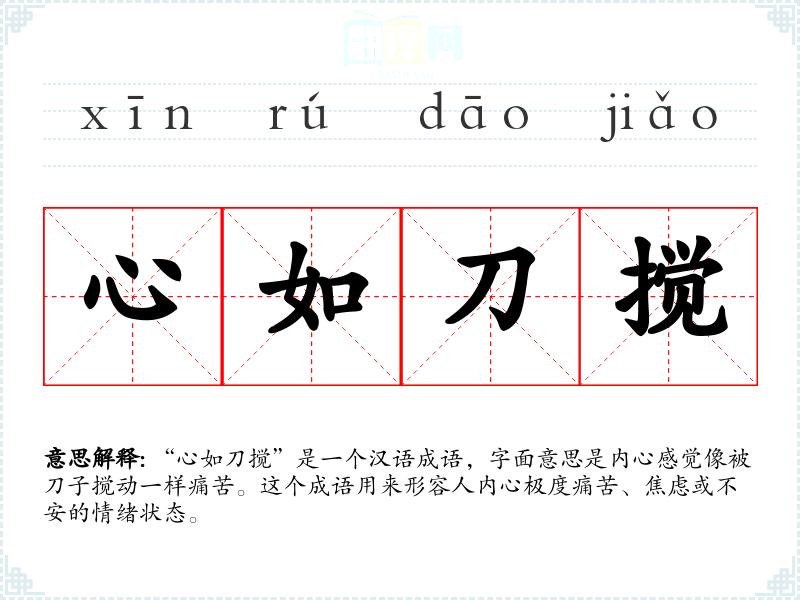 “心如刀搅”是一个汉语成语,字面意思是内心感觉像被刀子搅动一样痛苦。这个成语用来形容人内心极度痛苦、焦虑或不安的情绪状态。