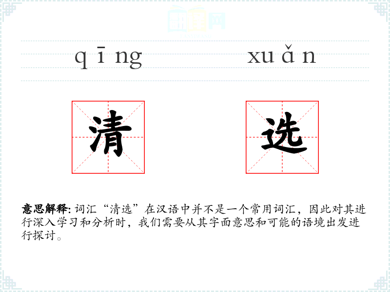 词汇“清选”在汉语中并不是一个常用词汇,因此对其进行深入学习和分析时,我们需要从其字面意思和可能的语境出发进行探讨。