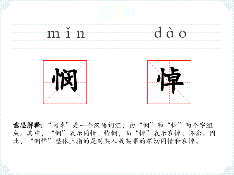 “悯悼”是一个汉语词汇,由“悯”和“悼”两个字组成。其中,“悯”表示同情、怜悯,而“悼”表示哀悼、怀念。因此,“悯悼”整体上指的是对某人或某事的深切同情和哀悼。