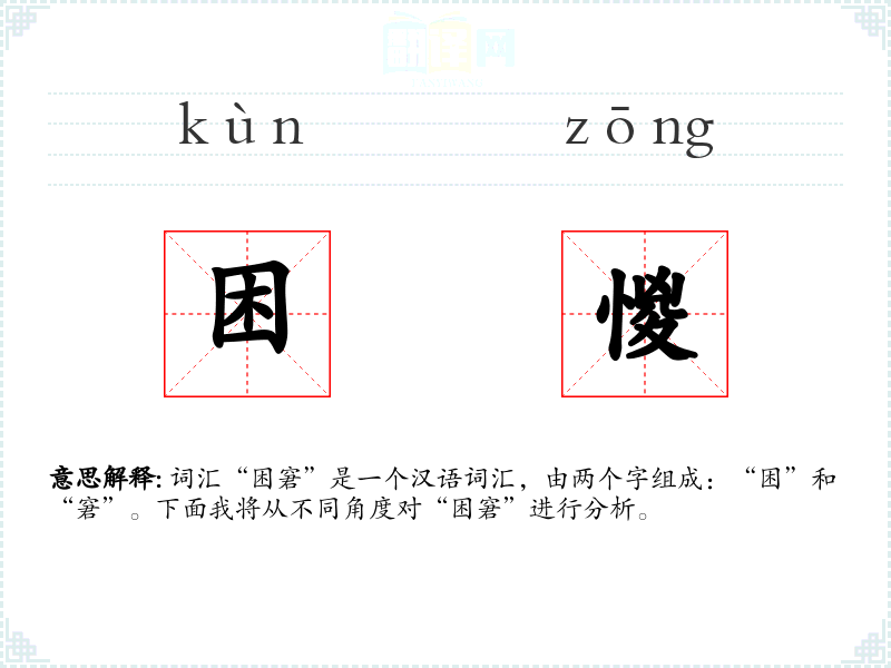 “困”字最早见于甲骨文,原意是围困、困难。“窘”字则有狭窄、困迫的意思。两个字组合在一起,强调了困境和心理上的压迫感。