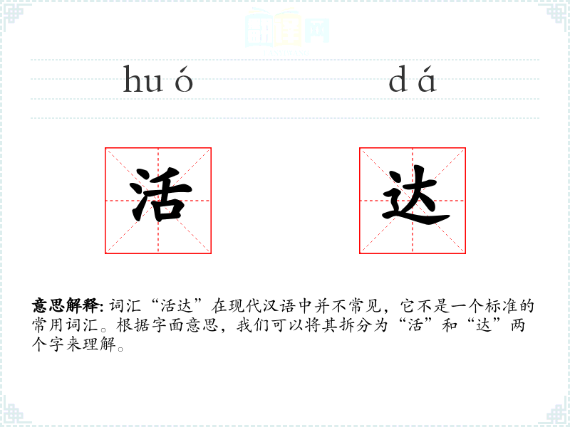 词汇“活达”在现代汉语中并不常见,它不是一个标准的常用词汇。根据字面意思,我们可以将其拆分为“活”和“达”两个字来理解。