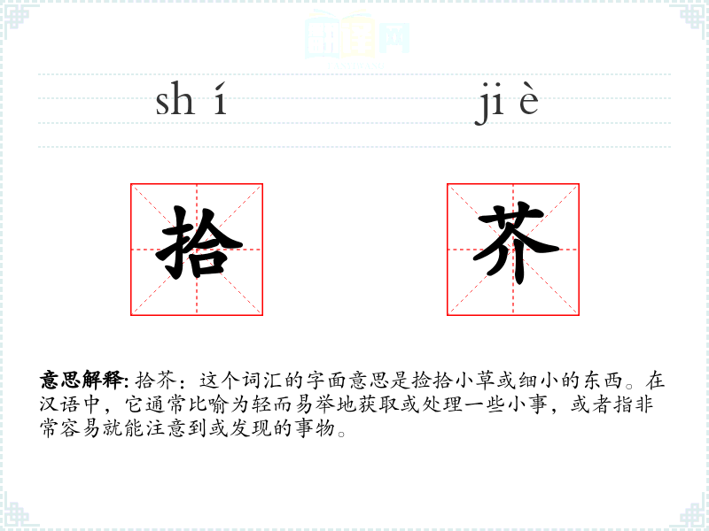 - 文学:在文学作品中,“拾芥”常用来形容人物的细心或对小事的关注,如“他像拾芥一样细心地整理着书架上的每一本书。”