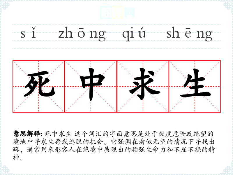 死中求生 这个词汇的字面意思是处于极度危险或绝望的境地中寻求生存或逃脱的机会。它强调在看似无望的情况下寻找出路,通常用来形容人在绝境中展现出的顽强生命力和不屈不挠的精神。