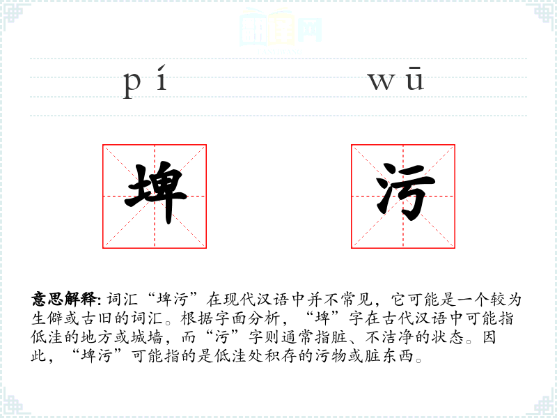 词汇“埤污”在现代汉语中并不常见,它可能是一个较为生僻或古旧的词汇。根据字面分析,“埤”字在古代汉语中可能指低洼的地方或城墙,而“污”字则通常指脏、不洁净的状态。因此,“埤污”可能指的是低洼处积存的污物或脏东西。