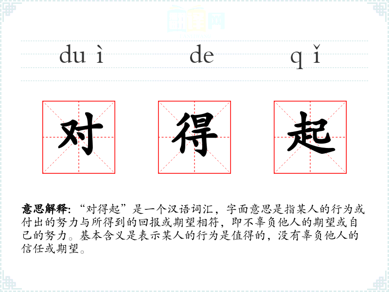 “对得起”是一个汉语词汇,字面意思是指某人的行为或付出的努力与所得到的回报或期望相符,即不辜负他人的期望或自己的努力。基本含义是表示某人的行为是值得的,没有辜负他人的信任或期望。
