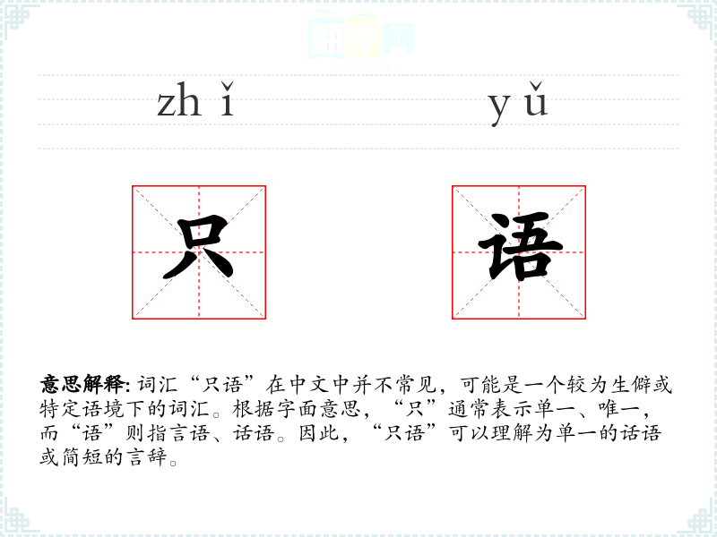 词汇“只语”在中文中并不常见,可能是一个较为生僻或特定语境下的词汇。根据字面意思,“只”通常表示单一、唯一,而“语”则指言语、话语。因此,“只语”可以理解为单一的话语或简短的言辞。