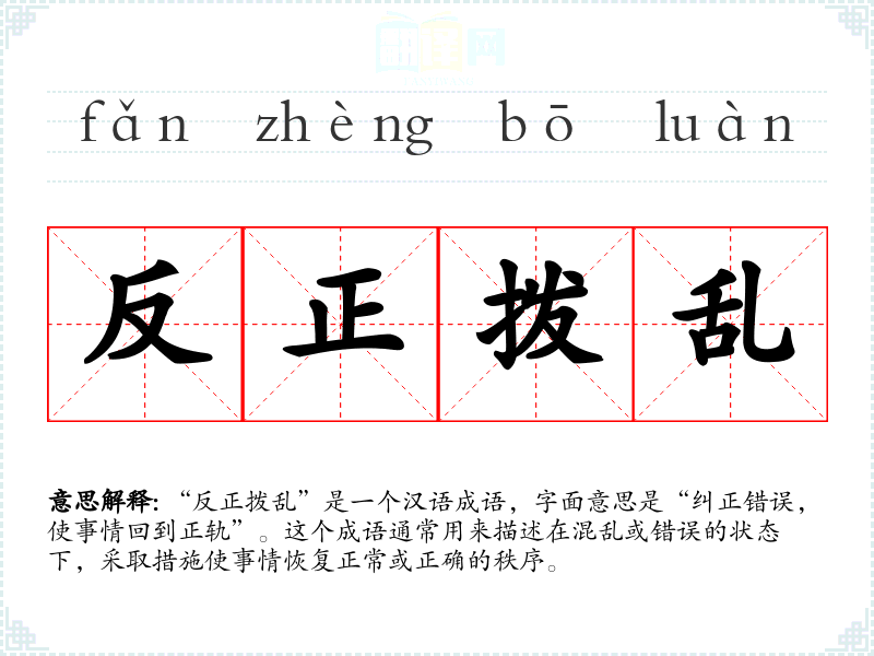 “反正拨乱”是一个汉语成语,字面意思是“纠正错误,使事情回到正轨”。这个成语通常用来描述在混乱或错误的状态下,采取措施使事情恢复正常或正确的秩序。