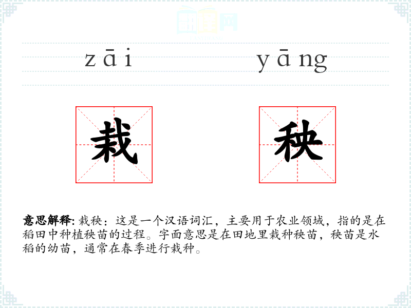 栽秧:这是一个汉语词汇,主要用于农业领域,指的是在稻田中种植秧苗的过程。字面意思是在田地里栽种秧苗,秧苗是水稻的幼苗,通常在春季进行栽种。