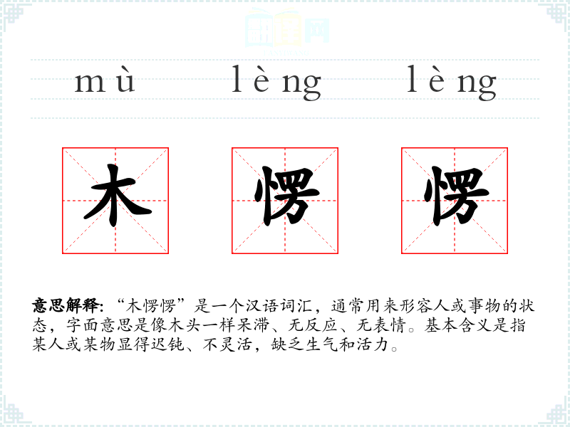 “木愣愣”是一个汉语词汇,通常用来形容人或事物的状态,字面意思是像木头一样呆滞、无反应、无表情。基本含义是指某人或某物显得迟钝、不灵活,缺乏生气和活力。
