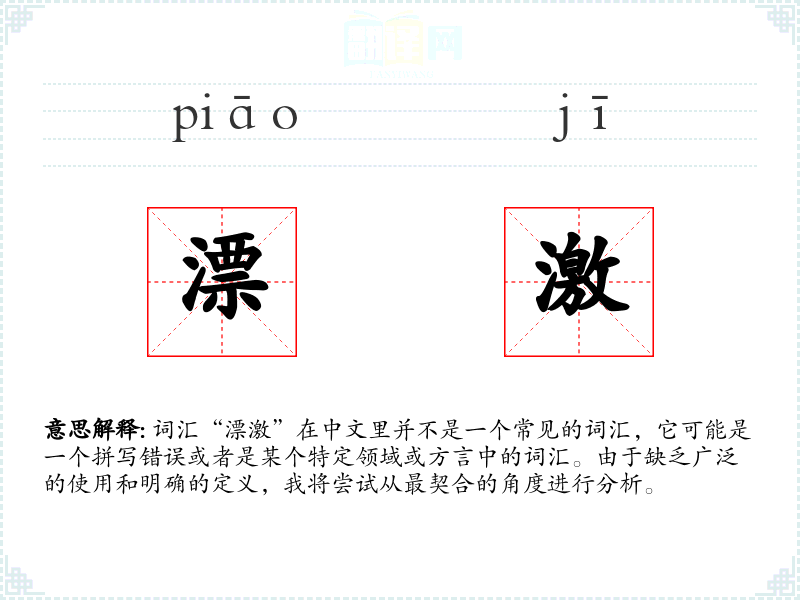 由于“漂激”不是一个标准词汇,我们无法给出确切的基本定义。它可能是“漂”和“激”两个字的组合,但这种组合在标准汉语中没有明确的意义。