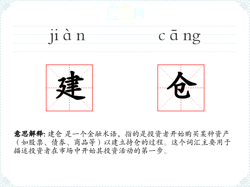 在金融专业领域,“建仓”通常涉及到详细的市场分析、风险评估和资金管理。在口语或非正式场合,这个词可能被简化为“开始买”或“入手”。在文学作品中,这个词可能被用来描述角色的投资决策过程,反映其性格或故事情节的发展。