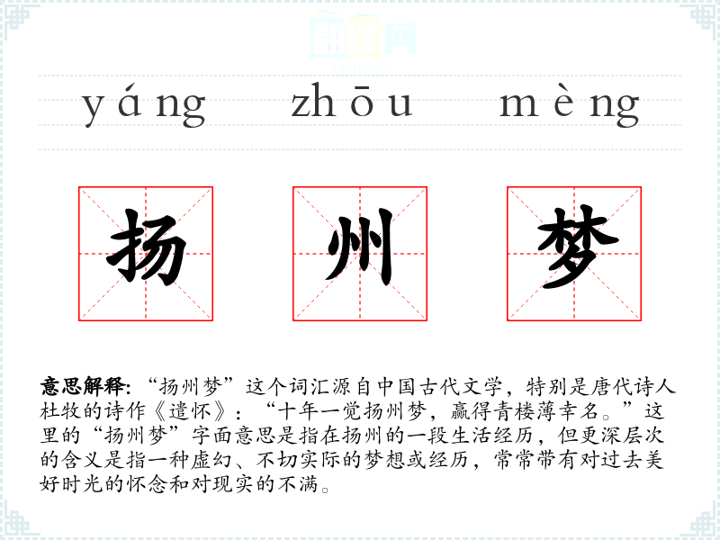 “扬州梦”一词最早出现在唐代诗人杜牧的诗中,后来被广泛用于文学作品中,成为表达虚幻梦想的常用词汇。随着时间的推移,这个词的含义逐渐固定,成为中文词汇中表达虚幻梦想的典型例子。