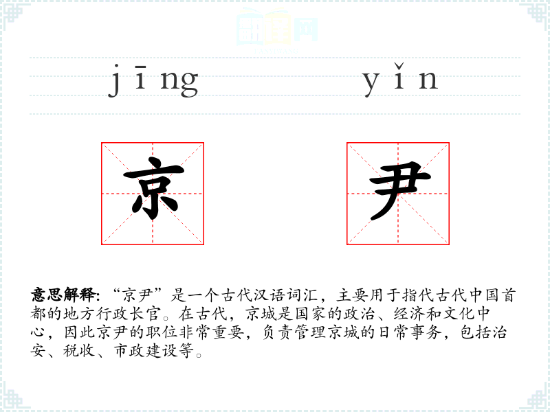 在文学作品中,“京尹”常常被用来指代权威和权力的象征,有时也用来形容某人的地位显赫或责任重大。在口语中,这个词汇可能不太常用,但在历史或古代题材的讨论中,它仍然是一个重要的术语。在专业领域,如历史学、考古学和古代文学研究中,“京尹”是一个专业术语,用于描述古代行政体系和官职。