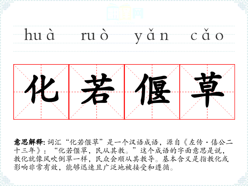 词汇“化若偃草”是一个汉语成语,源自《左传·僖公二十三年》:“化若偃草,民从其教。”这个成语的字面意思是说,教化就像风吹倒草一样,民众会顺从其教导。基本含义是指教化或影响非常有效,能够迅速且广泛地被接受和遵循。