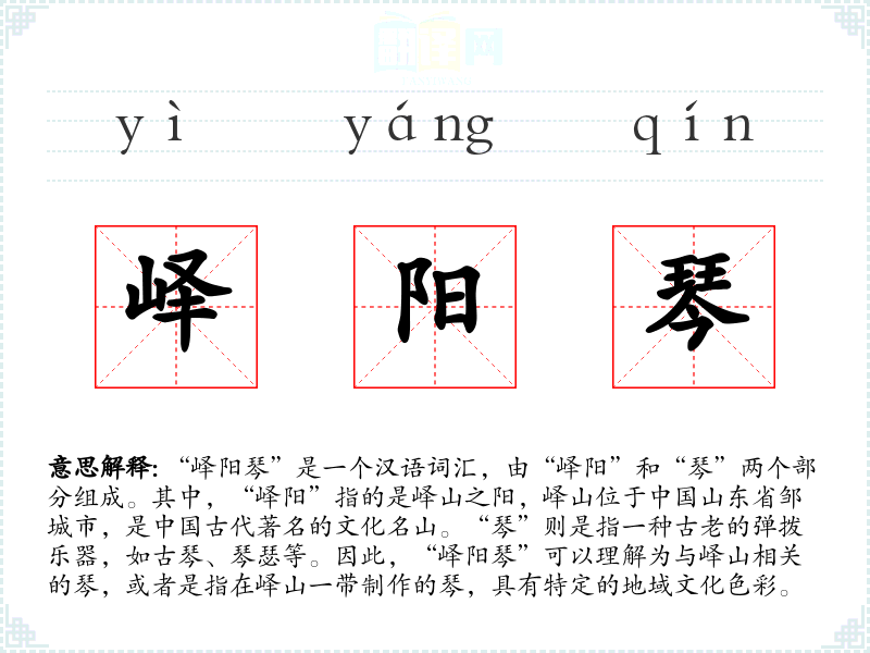 “峄阳琴”是一个汉语词汇,由“峄阳”和“琴”两个部分组成。其中,“峄阳”指的是峄山之阳,峄山位于山东省邹城市,是古代著名的文化名山。“琴”则是指一种古老的弹拨乐器,如古琴、琴瑟等。因此,“峄阳琴”可以理解为与峄山相关的琴,或者是指在峄山一带制作的琴,具有特定的地域文化色彩。