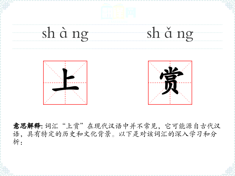 词汇“上赏”在现代汉语中并不常见,它可能源自古代汉语,具有特定的历史和文化背景。以下是对该词汇的深入学*和分析:
