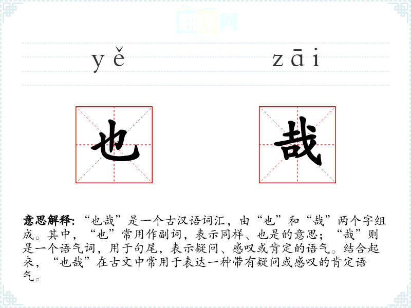 - 反义词:由于“也哉”主要用于表达肯定或感叹的语气,其反义词并不直接存在,但在语境中可以通过否定词或其他语气词来表达相反的情感。