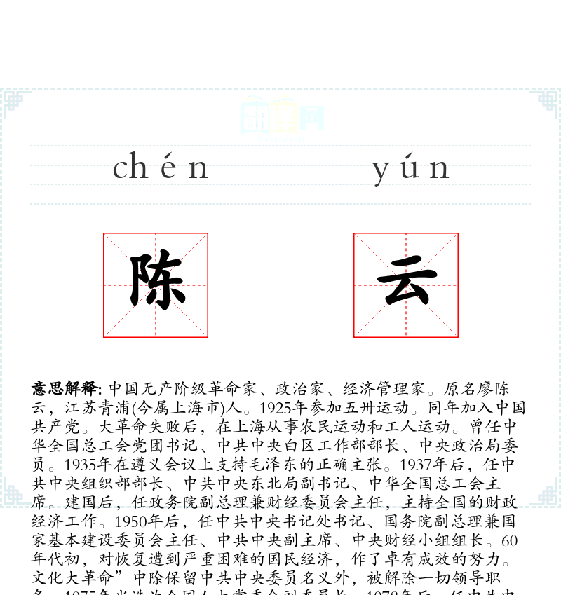 中国无产阶级革命家、政治家、经济管理家。原名廖陈云,江苏青浦(今属上海市)人。1925年参加五卅运动。同年加入中国共产党。大革命失败后,在上海从事农民运动和工人运动。曾任中华全国总工会党团书记、中共中央白区工作部部长、中央政治局委员。1935年在遵义会议上支持毛泽东的正确主张。1937年后,任中共中央组织部部长、中共中央东北局副书记、中华全国总工会主席。建国后,任政务院副总理兼财经委员会主任,主持全国的财政经济工作。1950年后,任中共中央书记处书记、国务院副总理兼国家基本建设委员会主任、中共中央副主席、中央财经小组组长。60年代初,对恢复遭到严重困难的国民经济,作了卓有成效的努力。文化大革命”中除保留中共中央委员名义外,被解除一切领导职务。1975年当选为全国人大常委会副委员长。1978年后,任中共中央副主席、中央纪律检查委员会第一书记、国务院副总理、中共中央顾问委员会主任。参与制定和实施新时期党的路线、方针和政策,并提出执政党的党风问题是有关党的生死存亡的问题等重要思想。主要著作编为《陈云文选》。