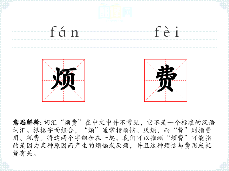 词汇“烦费”在中文中并不常见,它不是一个标准的汉语词汇。根据字面组合,“烦”通常指烦恼、厌烦,而“费”则指费用、耗费。将这两个字组合在一起,我们可以推测“烦费”可能指的是因为某种原因而产生的烦恼或厌烦,并且这种烦恼与费用或耗费有关。