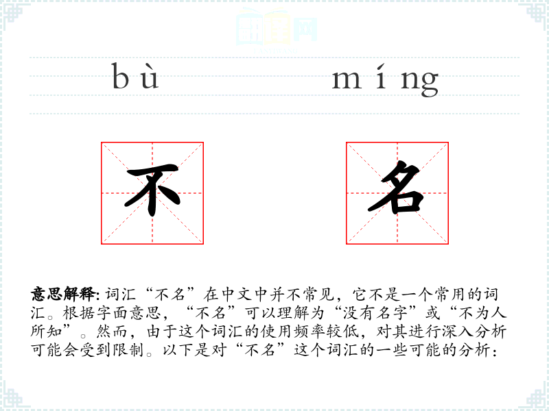 - 文学:在文学作品中,“不名”可能用来形容一个神秘或未知的人物,或者一个未被详细描述的事物。