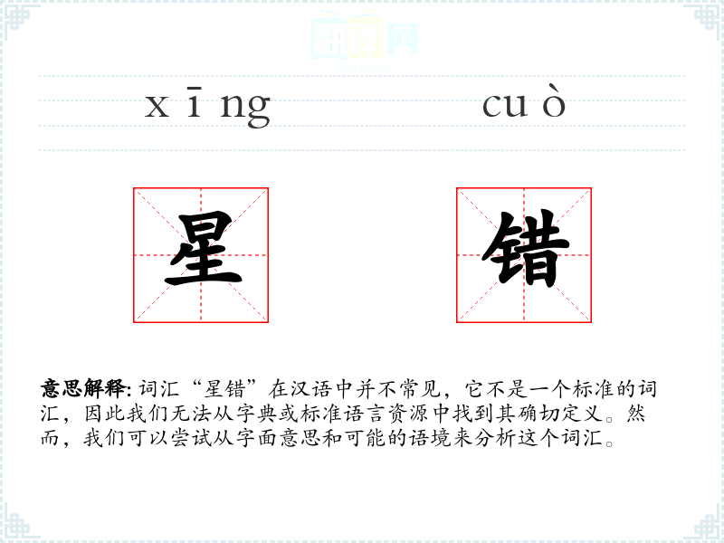 词汇“星错”在汉语中并不常见,它不是一个标准的词汇,因此我们无法从字典或标准语言资源中找到其确切定义。然而,我们可以尝试从字面意思和可能的语境来分析这个词汇。