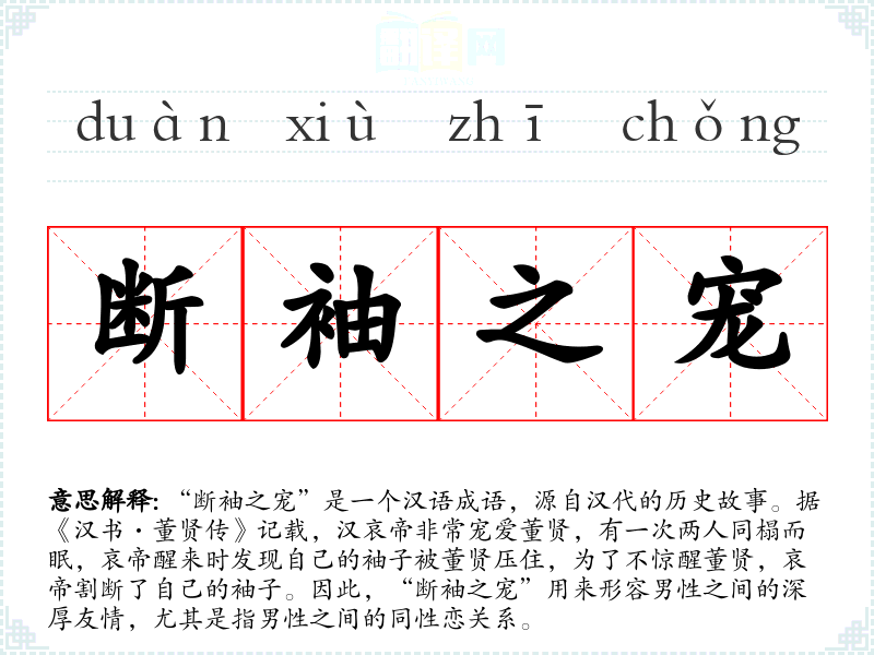“断袖之宠”是一个汉语成语,源自汉代的历史故事。据《汉书·董贤传》记载,汉哀帝非常宠爱董贤,有一次两人同榻而眠,哀帝醒来时发现自己的袖子被董贤压住,为了不惊醒董贤,哀帝割断了自己的袖子。因此,“断袖之宠”用来形容男性之间的深厚友情,尤其是指男性之间的同性恋关系。