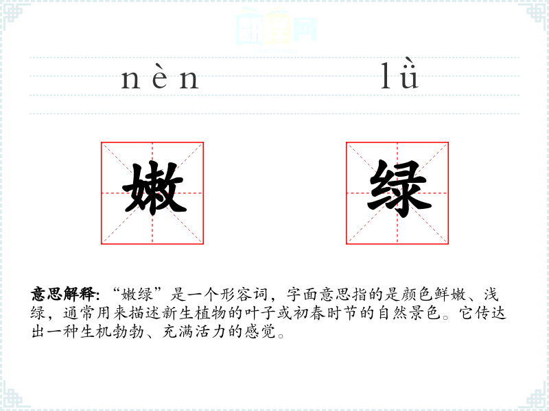 “嫩绿”是一个形容词,字面意思指的是颜色鲜嫩、浅绿,通常用来描述新生植物的叶子或初春时节的自然景色。它传达出一种生机勃勃、充满活力的感觉。
