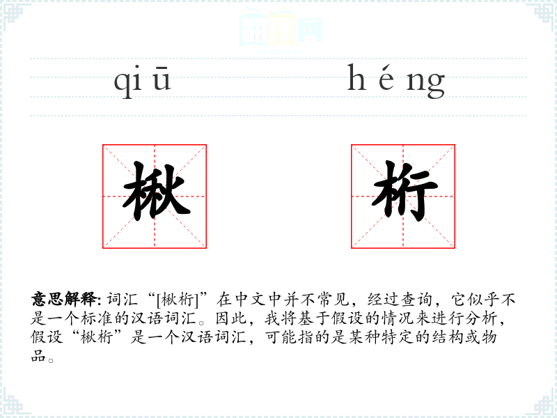 词汇“[楸桁]”在中文中并不常见,经过查询,它似乎不是一个标准的汉语词汇。因此,我将基于假设的情况来进行分析,假设“楸桁”是一个汉语词汇,可能指的是某种特定的结构或物品。