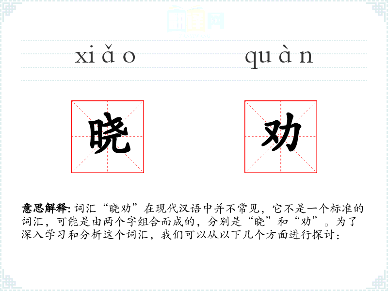 词汇“晓劝”在现代汉语中并不常见,它不是一个标准的词汇,可能是由两个字组合而成的,分别是“晓”和“劝”。为了深入学习和分析这个词汇,我们可以从以下几个方面进行探讨: