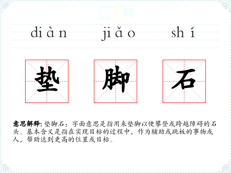 垫脚石:字面意思是指用来垫脚以便攀登或跨越障碍的石头。基本含义是指在实现目标的过程中,作为辅助或跳板的事物或人,帮助达到更高的位置或目标。