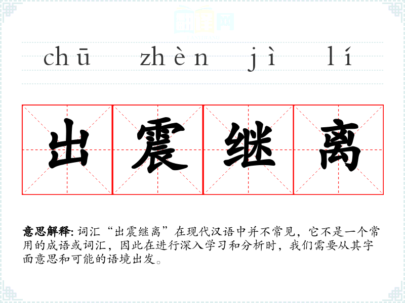 词汇“出震继离”在现代汉语中并不常见,它不是一个常用的成语或词汇,因此在进行深入学*和分析时,我们需要从其字面意思和可能的语境出发。