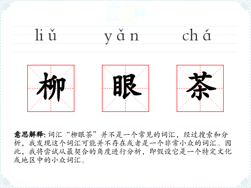 词汇“柳眼茶”并不是一个常见的词汇,经过搜索和分析,我发现这个词汇可能并不存在或者是一个非常小众的词汇。因此,我将尝试从最契合的角度进行分析,即假设它是一个特定文化或地区中的小众词汇。