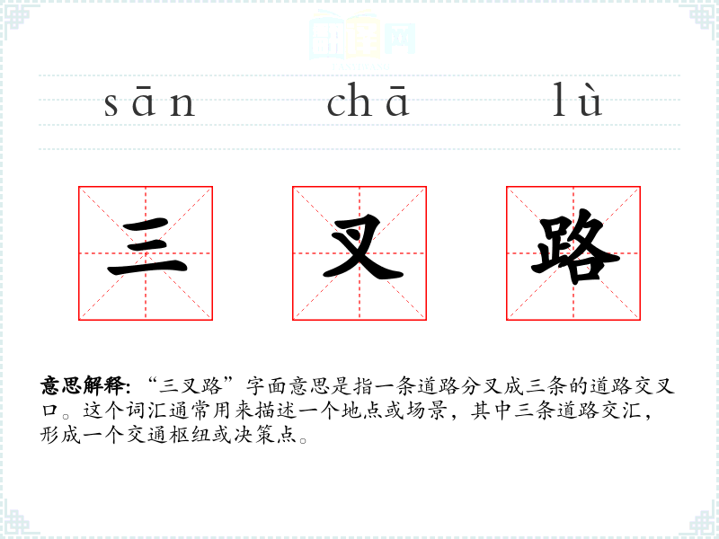 “三叉路”字面意思是指一条道路分叉成三条的道路交叉口。这个词汇通常用来描述一个地点或场景,其中三条道路交汇,形成一个交通枢纽或决策点。