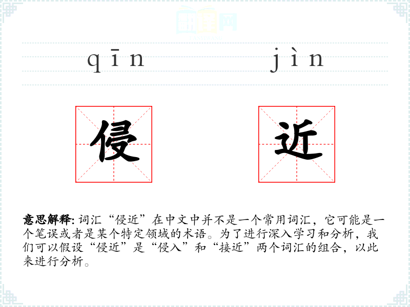 词汇“侵近”在中文中并不是一个常用词汇,它可能是一个笔误或者是某个特定领域的术语。为了进行深入学习和分析,我们可以假设“侵近”是“侵入”和“接近”两个词汇的组合,以此来进行分析。