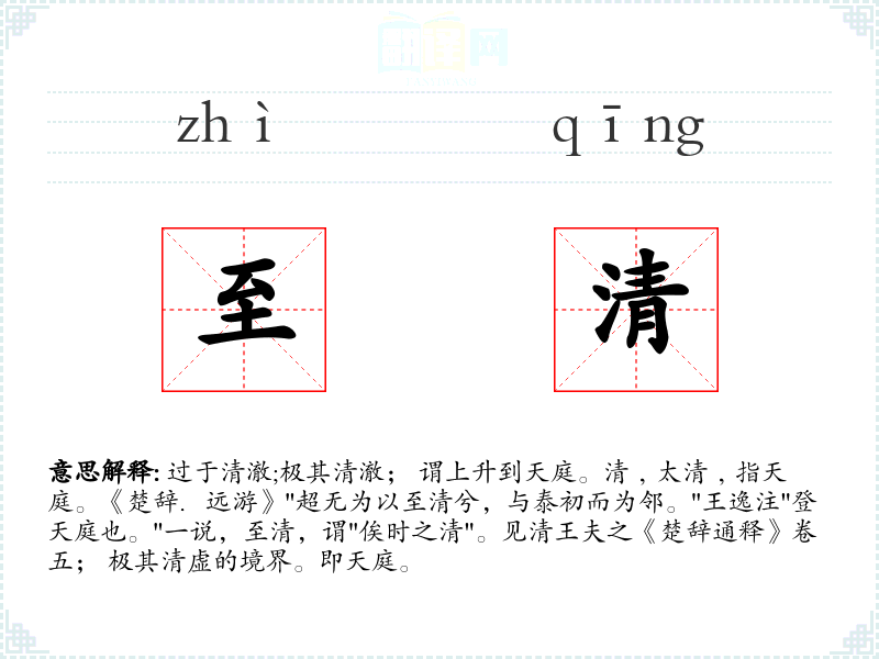1.过于清澈;极其清澈; 谓上升到天庭。清﹐太清﹐指天庭。《楚辞.远游》"超无为以至清兮,与泰初而为邻。"王逸注"登天庭也。"一说,至清,谓"俟时之清"。见清王夫之《楚辞通释》卷五; 极其清虚的境界。即天庭。