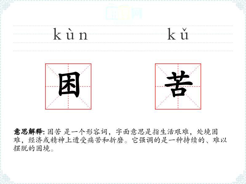 困苦 是一个形容词,字面意思是指生活艰难,处境困难,经济或精神上遭受痛苦和折磨。它强调的是一种持续的、难以摆脱的困境。