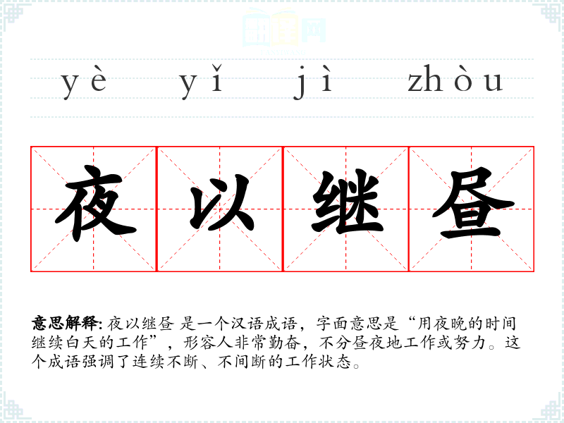 - 文学:在文学作品中,这个成语常用来形容主人公的勤奋和不懈努力,如“他夜以继昼地研究,终于取得了突破。”