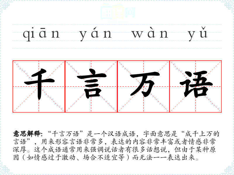 “千言万语”是一个汉语成语,字面意思是“成千上万的言语”,用来形容言语非常多,表达的内容非常丰富或者情感非常深厚。这个成语通常用来强调说话者有很多话想说,但由于某种原因(如情感过于激动、场合不适宜等)而无法一一表达出来。