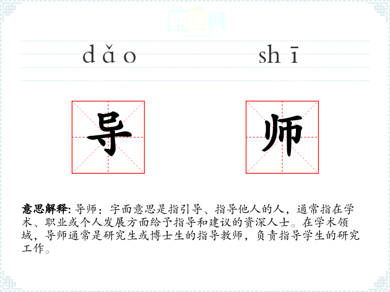 导师:字面意思是指引导、指导他人的人,通常指在学术、职业或个人发展方面给予指导和建议的资深人士。在学术领域,导师通常是研究生或博士生的指导教师,负责指导学生的研究工作。