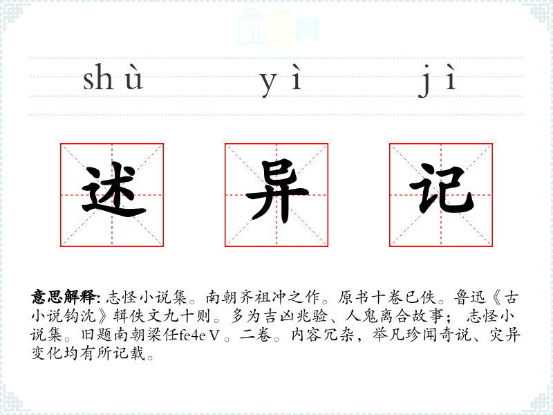 志怪小说集。南朝齐祖冲之作。原书十卷已佚。鲁迅《古小说钩沈》辑佚文九十则。多为吉凶兆验、人鬼离合故事; 志怪小说集。旧题南朝梁任fe4eV。二卷。内容冗杂,举凡珍闻奇说、灾异变化均有所记载。