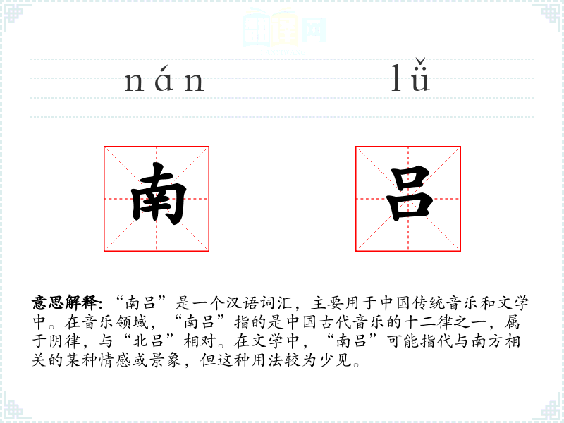 - 文学:在古典诗词中,“南吕”可能被用来形容南方的景色或情感,如“南吕清风”可能指代南方清爽的风。
