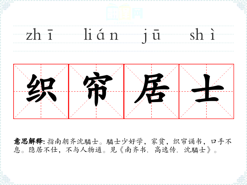 指南朝齐沈驎士。驎士少好学,家贫,织帘诵书,口手不息。隐居不仕,不与人物通。见《南齐书.高逸传.沈驎士》。