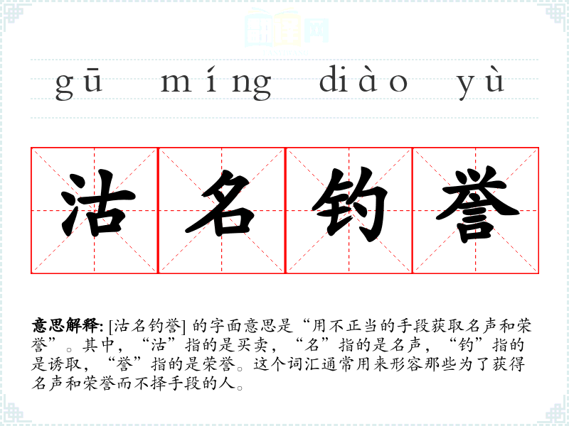 [沽名钓誉] 的字面意思是“用不正当的手段获取名声和荣誉”。其中,“沽”指的是买卖,“名”指的是名声,“钓”指的是诱取,“誉”指的是荣誉。这个词汇通常用来形容那些为了获得名声和荣誉而不择手段的人。