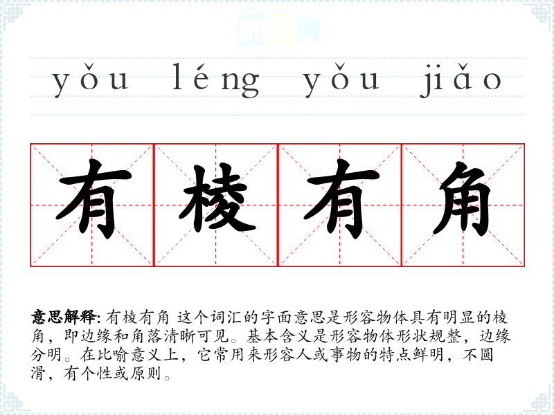 有棱有角 这个词汇的字面意思是形容物体具有明显的棱角,即边缘和角落清晰可见。基本含义是形容物体形状规整,边缘分明。在比喻意义上,它常用来形容人或事物的特点鲜明,不圆滑,有个性或原则。